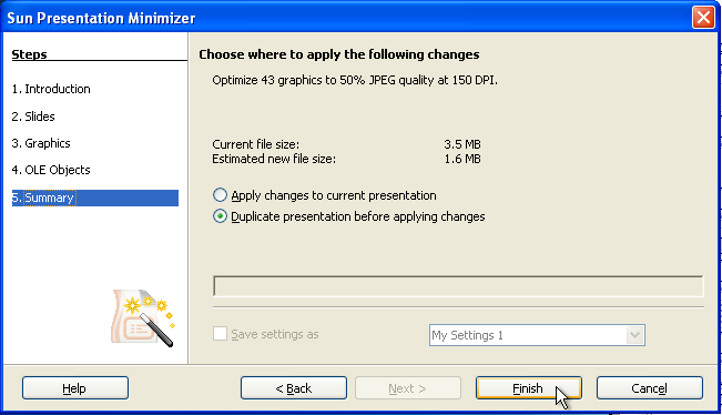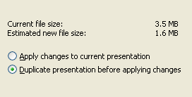 Presentation Minimizer ExtensionThe Sun Presentation Minimizer is used to reduce the file size of the current presentation. Images will be compressed, and data that is no longer needed will be removed. The Sun Presentation Minimizer can optimize the image quality size. Presentations designed for screen or projector do not require the same high quality as presentations designed for print. |