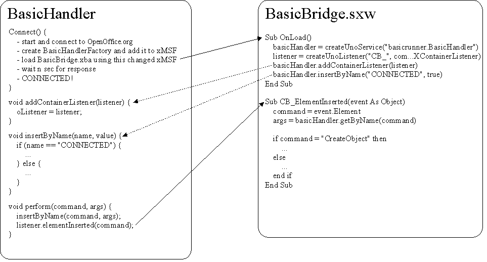 To provide passing of information in the other direction, Basic listeners are used. BasicHandler implements the XContainer UNO interface. This allows the registering of a listener, which enables Java to call functions for it.